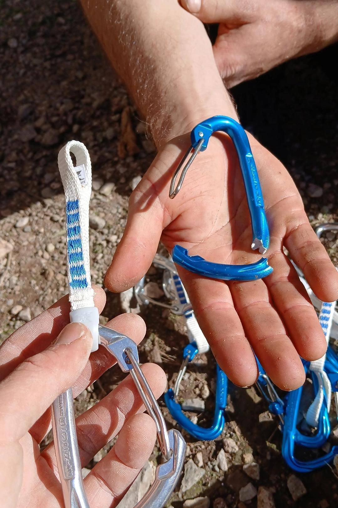 Aujourd'hui nous les avons inaugurée. Je me suis engagée dans une voie assez difficile, et lors d’un petit plomb [30 cm au dessus du point] la dégaine du dessous a littéralement pétée. Toutes les dégaines étaient à l’endroit et du bon côté par rapport au boulon. J’ai pris un plomb qui m’a redescendu violemment au 1 ier point [lors de la fracture de la degaine].